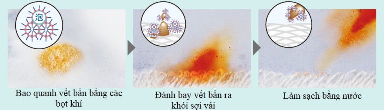 Sau khi chất tẩy rửa cùng nước tạo thành các bọt khí được bơm mạnh mẽ vào lồng giặt thông qua một vòi sen lớn giúp đánh bay vết bẩn một cách hiệu quả.