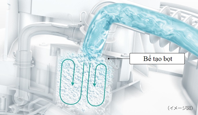 Chất tẩy rửa được bơm vào hộp tạo bọt từ đó tạo ra các bọt khí có kích thước siêu nhỏ và được phun mạnh mẽ vào lồng giặt.